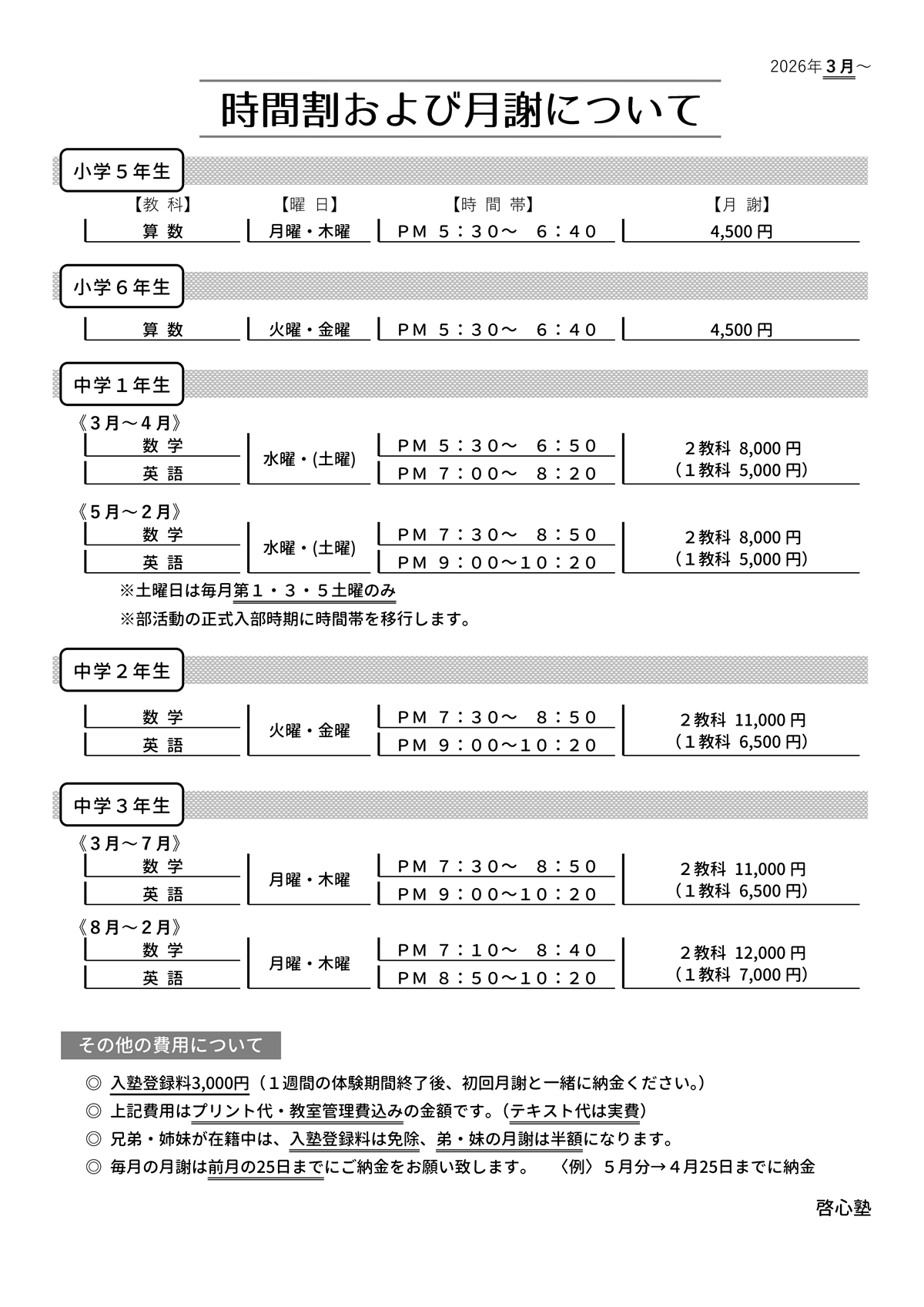 26’時間割/月謝